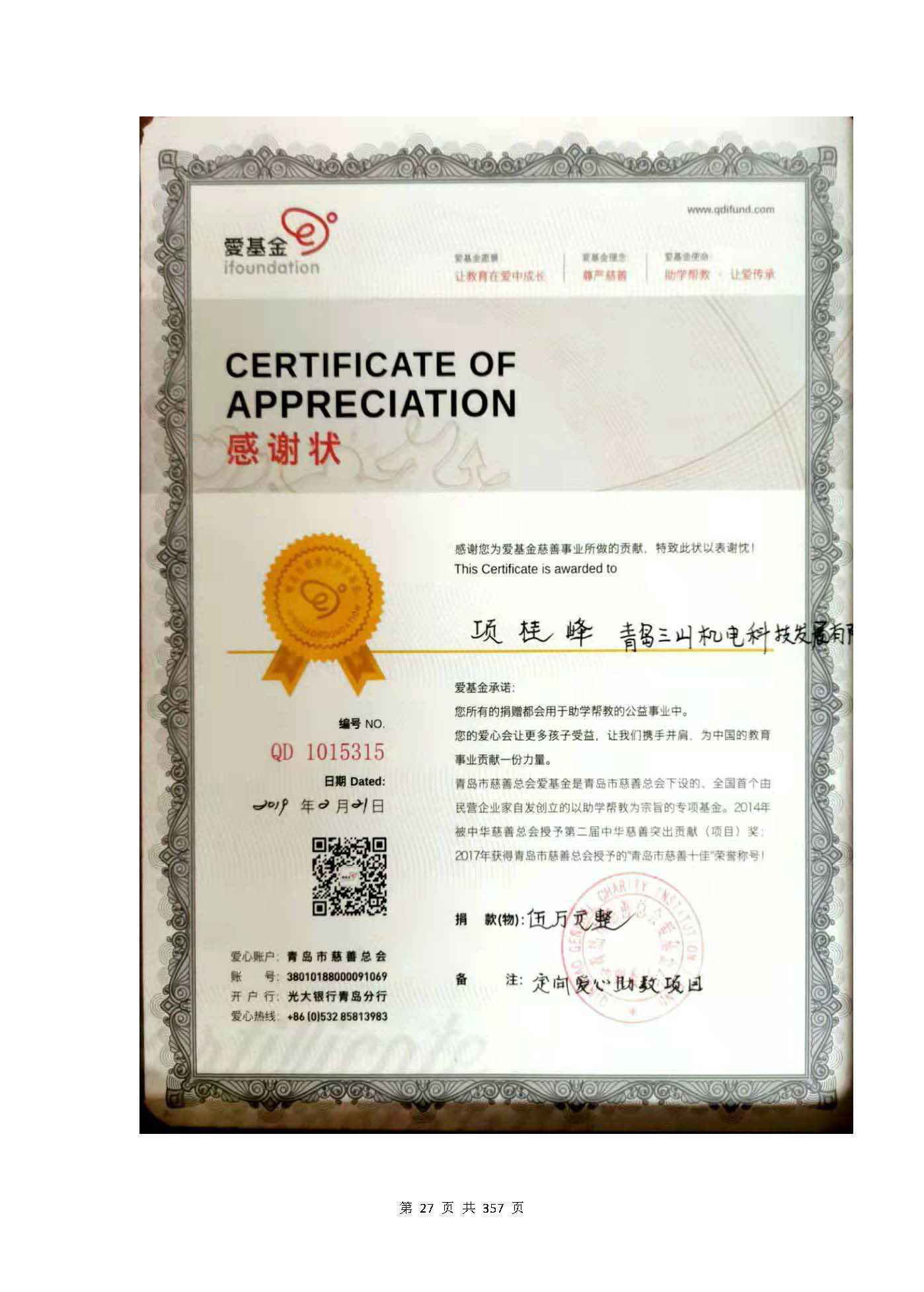 2019年2月,公司公司本着让更多的孩子受到更优质的教育,向“青岛市慈善总会-爱基金管理委员会”捐款人民币50000元整,扶持“定向爱心助学助教项目”,为中国的教育事业贡献一份力量。