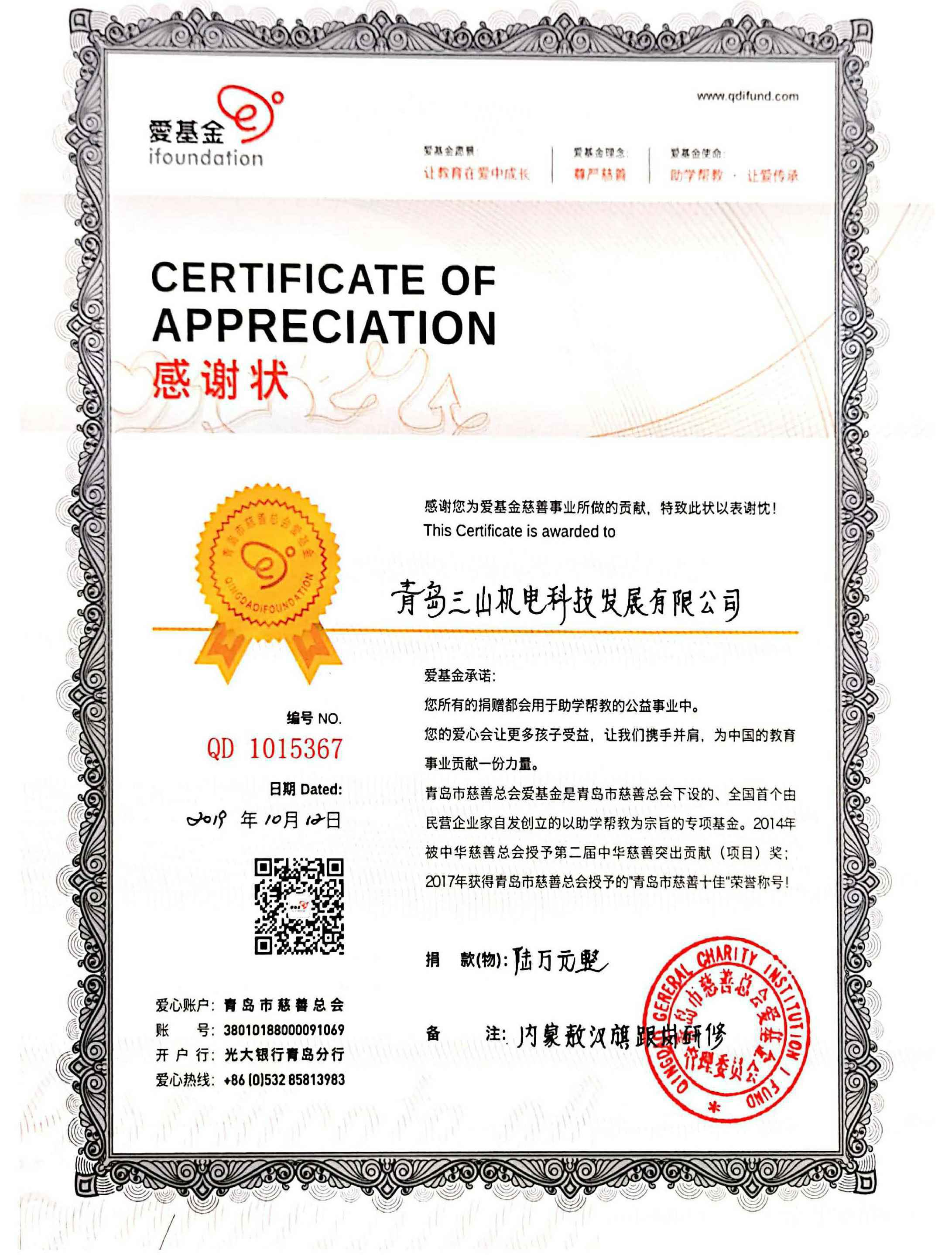 2019年10月,本着让教育在爱中成长的原则,响应“助学帮教-让爱传承”,公司公司再次向“青岛市慈善总会-爱基金管理委员会”捐款人民币60000元整,助力“内蒙敖汉旗跟岗研修”的教育事业
