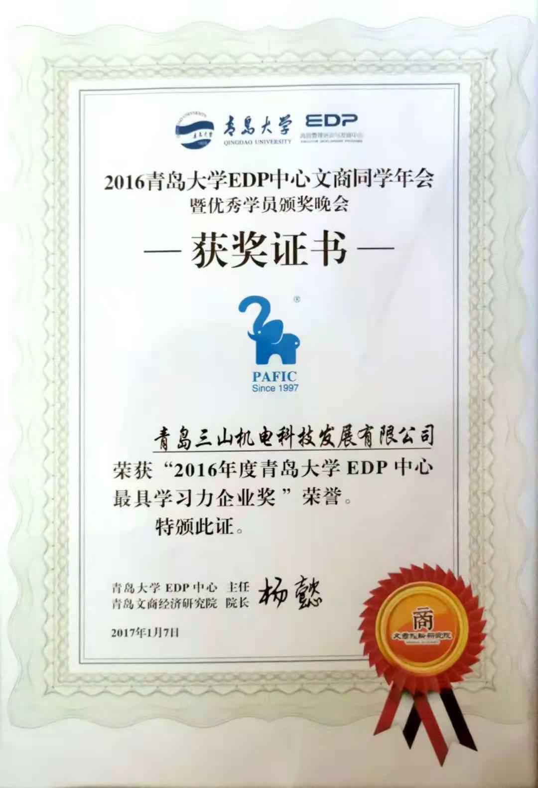 2017年1月,为进一步提高公司中高层领导的管理水平和思辨能力,拔高商战实践经验,持续输送中高层领导走入青岛大学文商经济研究院深造学习,通过中高层领导的刻苦认真、努力学习,荣获青岛大学EDP中心和青岛大学文商经济研究院颁发的“2016年度青岛大学EDP中心最具学习力企业奖”。