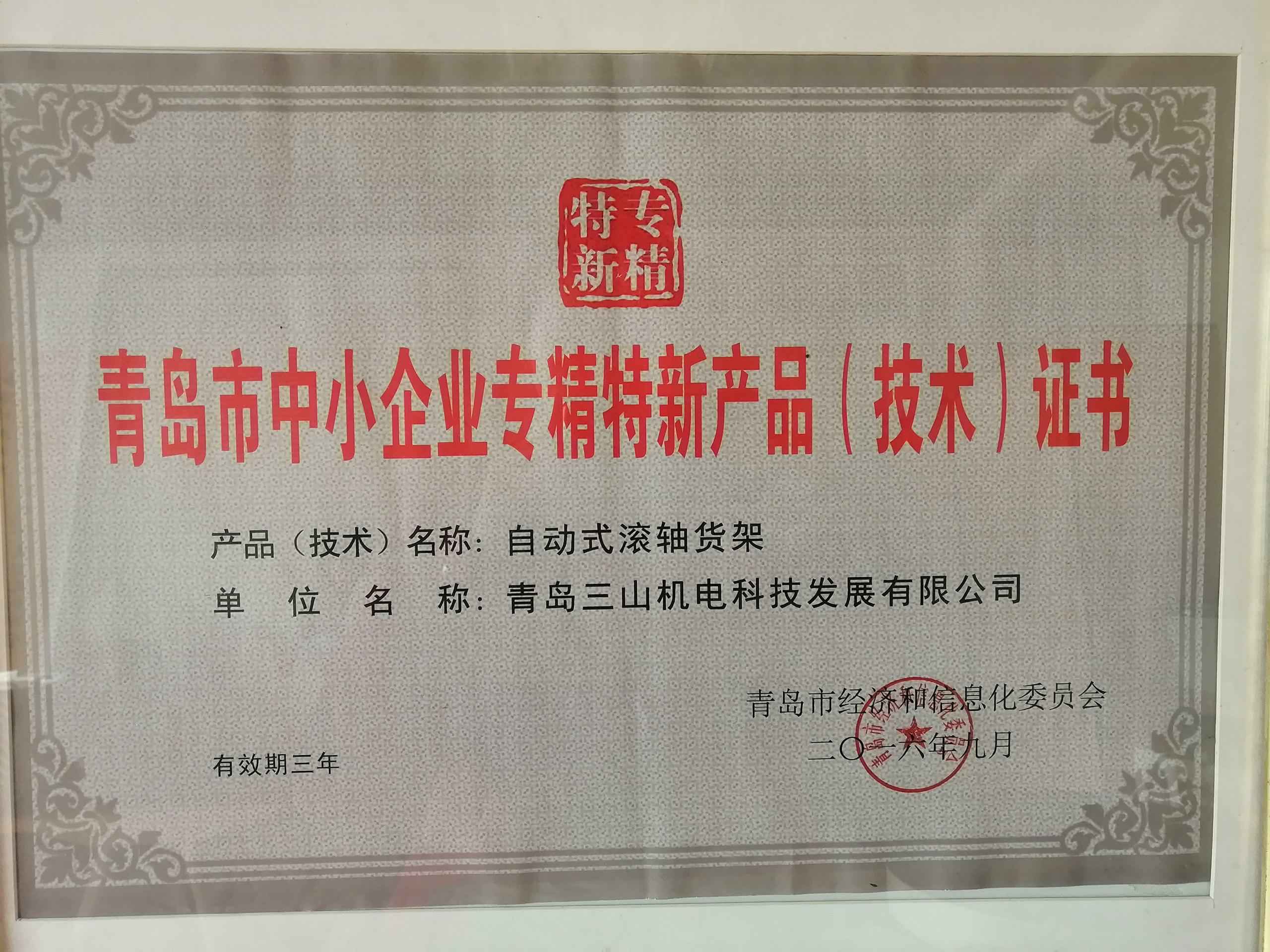 2016年9月,公司以技术中心自主研发的“自动式滚轴货架”产品,申报参与了青岛市举行的专精特评选活动,荣获青岛市经济和信息化委员会颁发的“青岛市中小企业专精特新产品(技术)证书”。